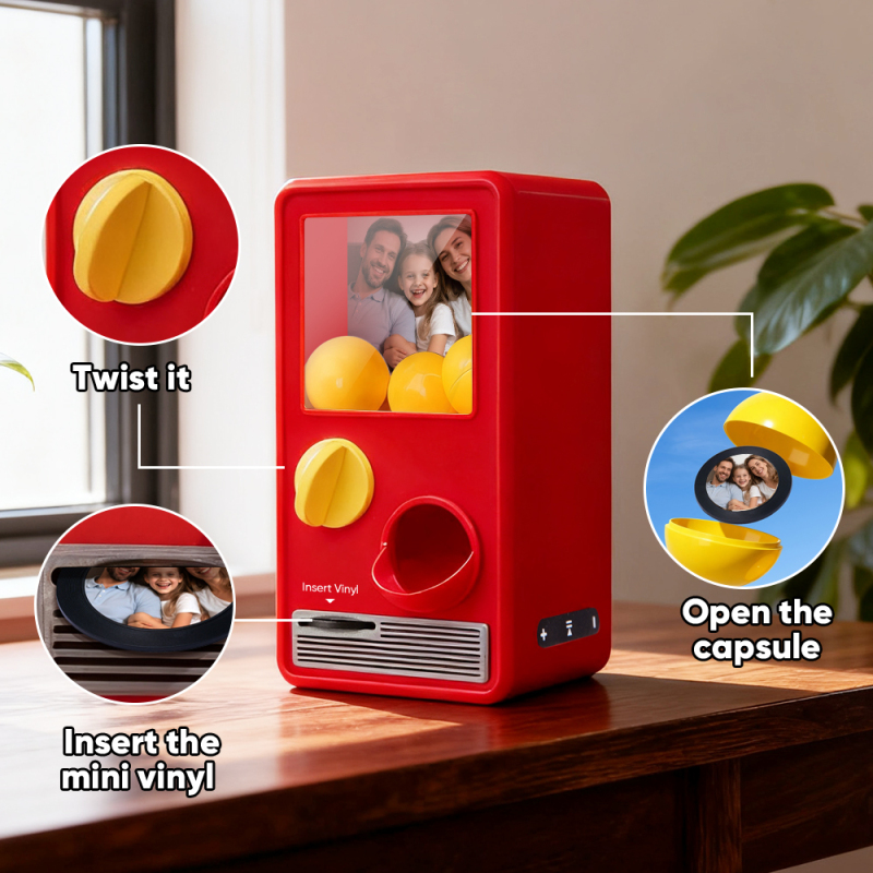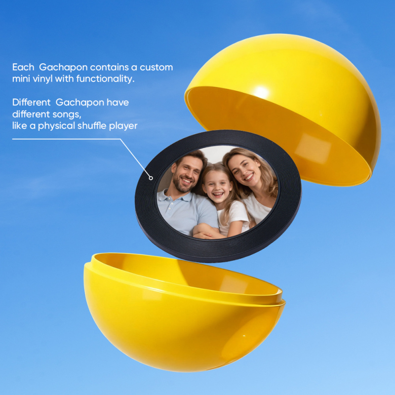Discover the joy of music and surprise with our Music Gachapon Machine! Modeled after a classic toy capsule dispenser, this charming unit holds up to 7 gachapon balls—each containing a unique, customizable CD record inside. Personalize every disc with a special song and a photo that holds meaning, then let the machine bring your creations to life with instant playback.