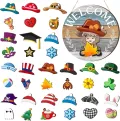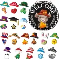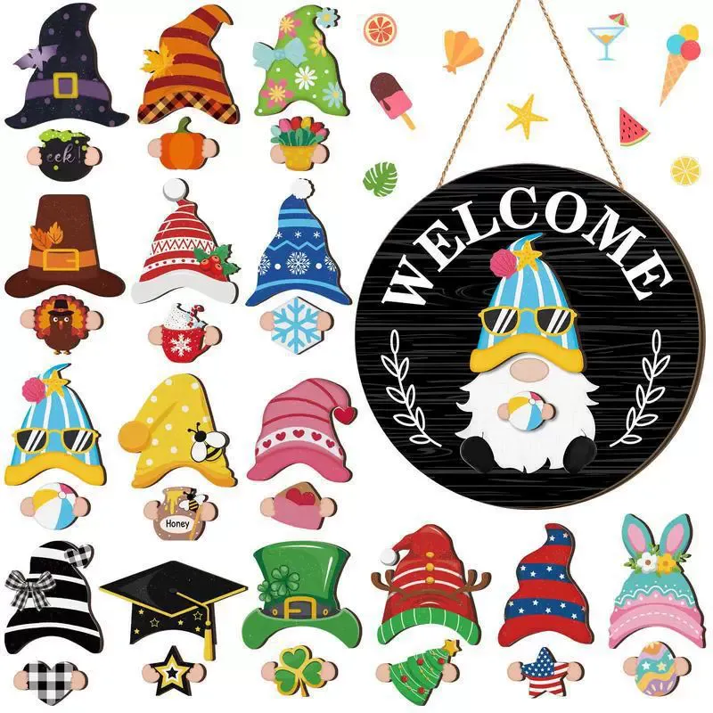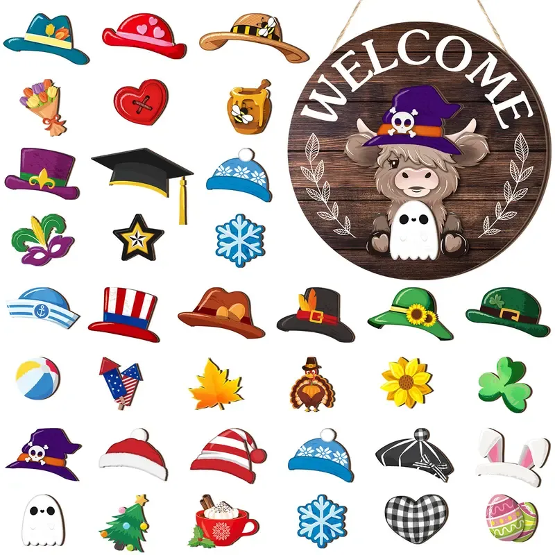 These cute set include 1 round sign + 17 magnetic hats and 17 accessories. So cute interchangeable seasonal decor for your home!