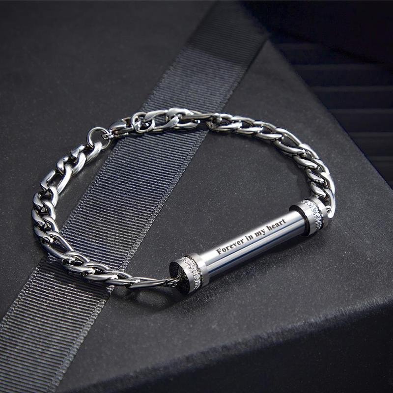Our Pragma Memorial jewellery collection of cremation pendants are made from stainless steel, which will endure heavy long lasting wear. This hypoallergenic material is very durable and extremely resistant to corrosion.This pendant comes complete with a box and also a funnel that you can easily add your loves one's ashes into the Bracelet.