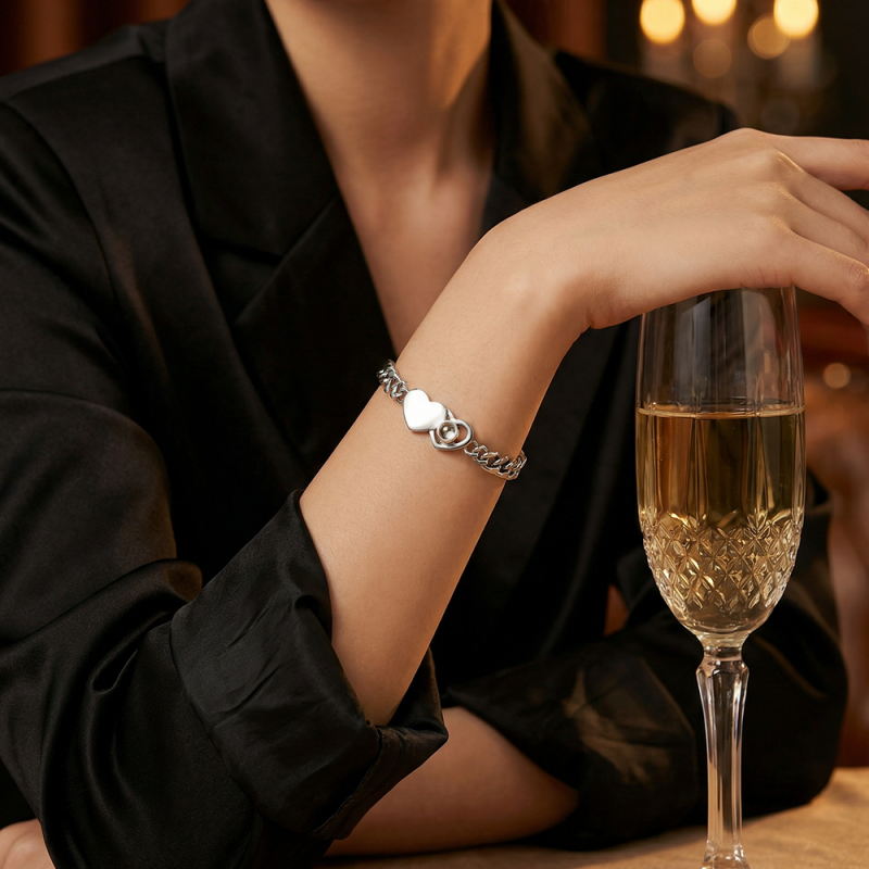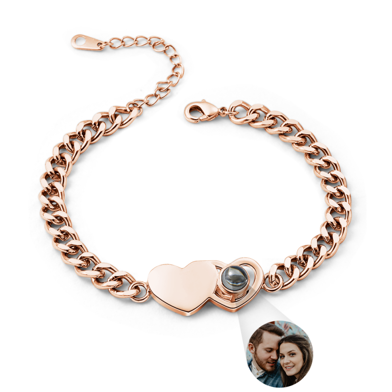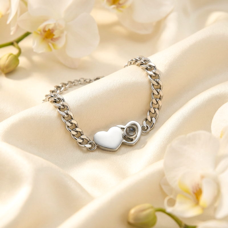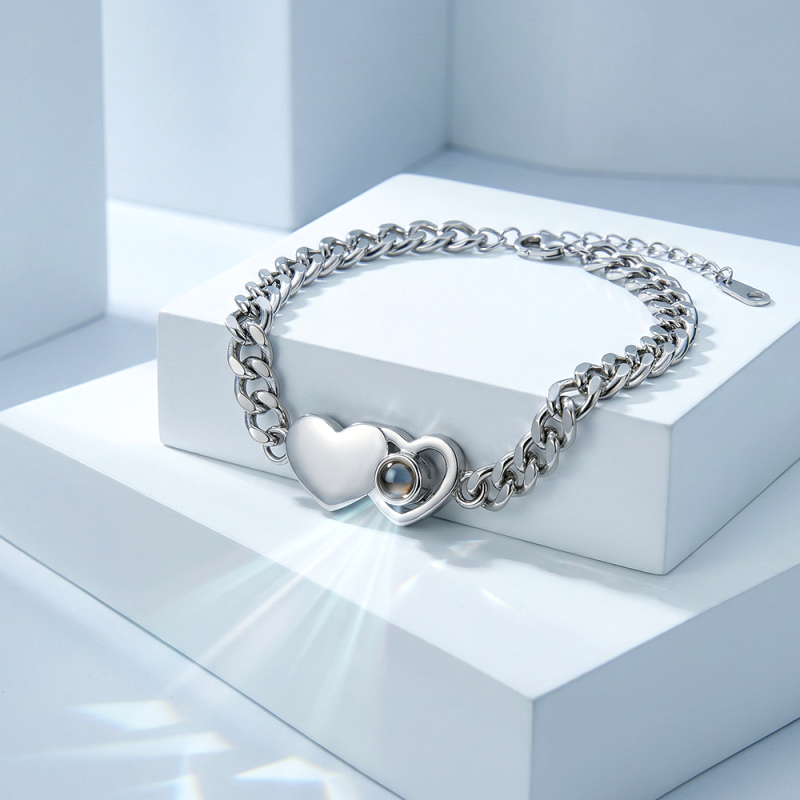 This custom heart-shaped Cuban chain photo projection bracelet perfectly blends bold style with romantic magic, making it the perfect Christmas gift for couples! It features a delicate Cuban chain (sturdy and durable, suitable for everyday wear) paired with a heart-shaped pendant containing your customized photo; with just a beam of light, your cherished moments-a first date, a wedding photo, or a sweet selfie-will be clearly projected.