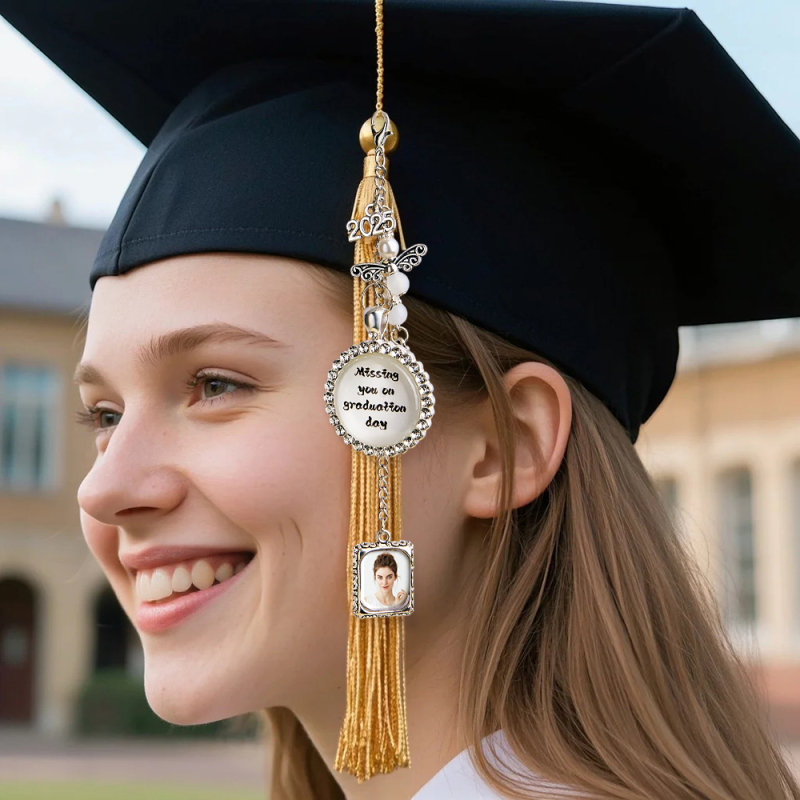 Celebrate your special memories with this personalized silver graduation cap tassel memorial photo charm. Adorned with sparkling rhinestones, this custom pendant can be personalized with a photo to honor and remember a loved one. Perfect for commemorating moments of love and loss, it features a memory picture frame design that helps you keep your cherished memories close. An elegant and meaningful accessory to express how much you miss someone dear.