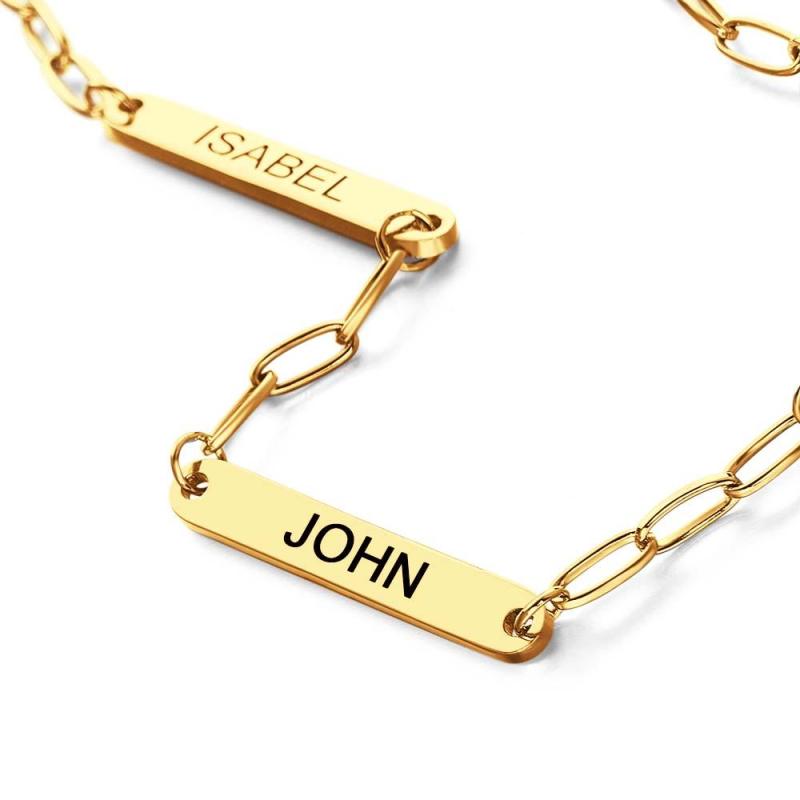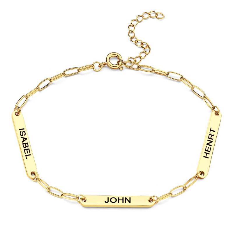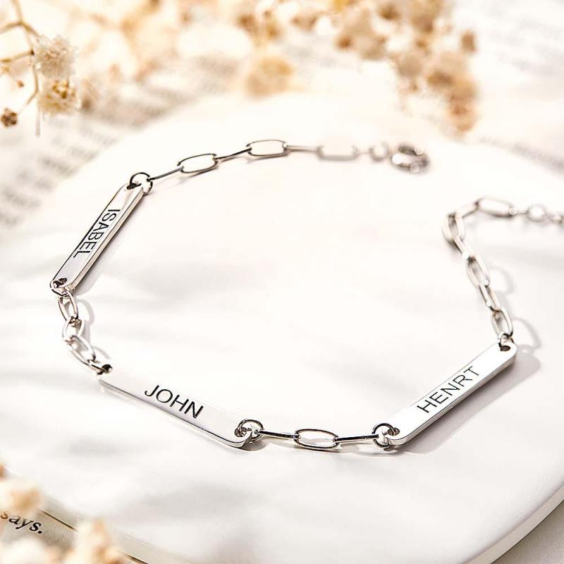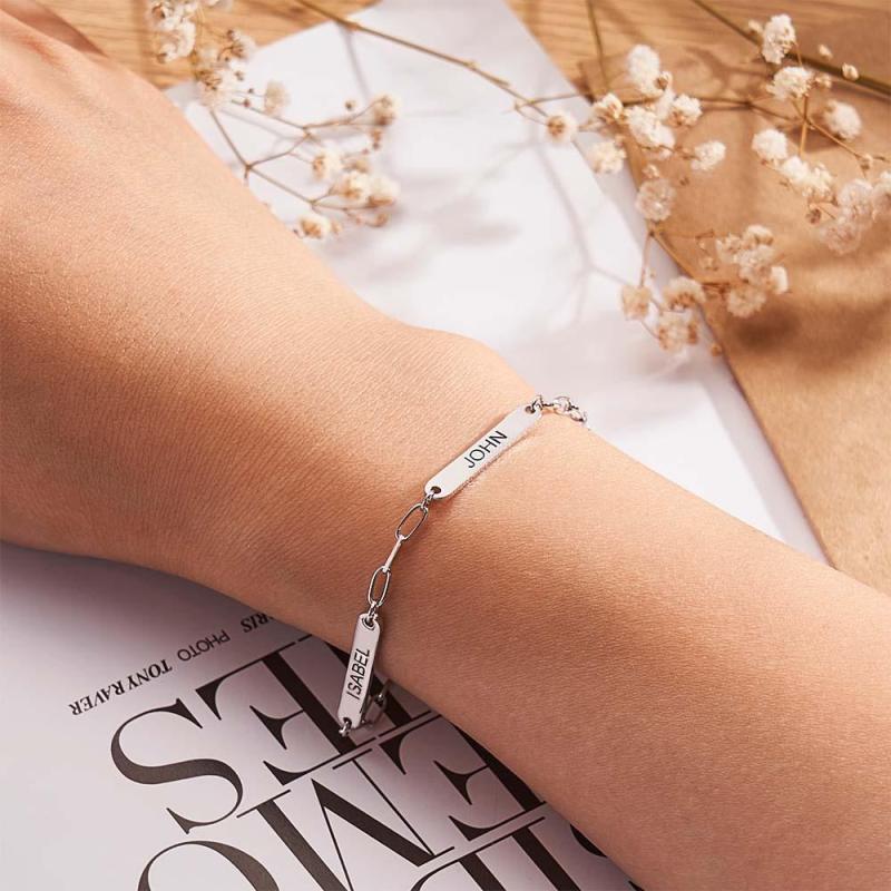 Personalise this bar bracelet with any names or words that are special to you. The paperclip bracelet chain can be accented with multiple charms to create the perfect customized gift.
