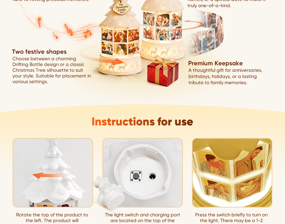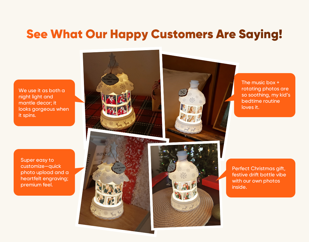 Illuminate your holidays with a personal touch. Our Custom Multi-Photo Rotating Night Light Music Box combines warm, cozy lighting with cherished memories. This unique night light rotates through up to 16 uploaded photos, turning your favorite moments into a gentle, moving slideshow that glows softly in any room.
