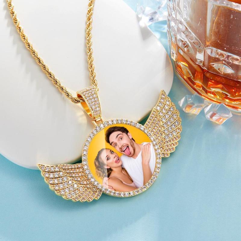 Custom Photo Necklace with Wings Medallions Necklace Iced Out Large Custom Picture Pendant Golden