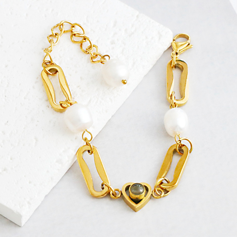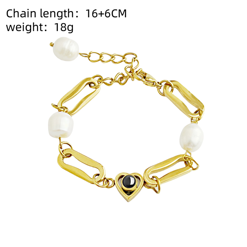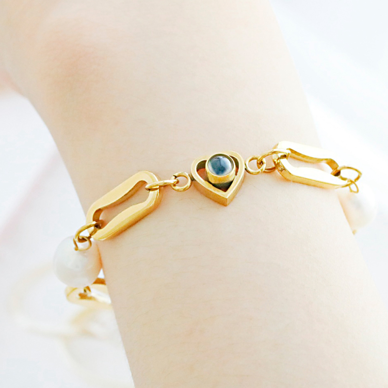 Custom Photo Projection Circle Heart Bracelet 18k Gold Plated Stainless Steel Cuban Link Freshwater Baroque Pearl Waterproof Bracelet Gift for Her