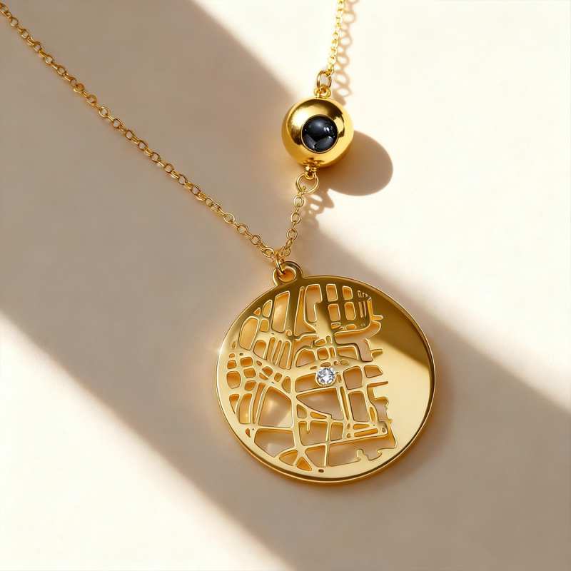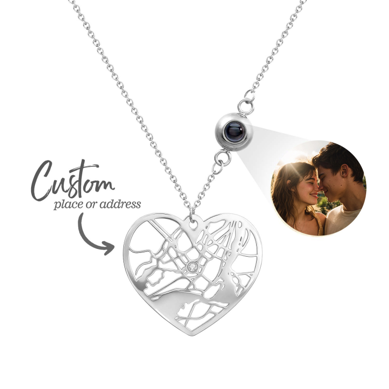 Capture memories in style with our Custom Photo Projection Necklace. This heartfelt piece features a discreet projection charm that displays a treasured photo when worn, turning everyday moments into a personal keepsake. The Cherished Spot Map design adds a meaningful touch by marking a special location, enhanced with a gemstone accent for a touch of elegance. Perfect as an Anniversary Gift or a thoughtful present for her, this necklace combines sentiment and sophistication.