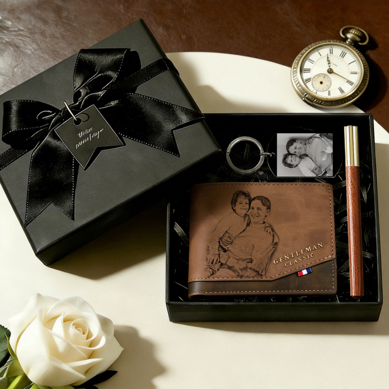 This Father’s Day set includes a custom photo wallet,a photo calendar keychain and a pen, compressing family portraits, children’s growing moments, or meaningful dates into palm-sized keepsakes.