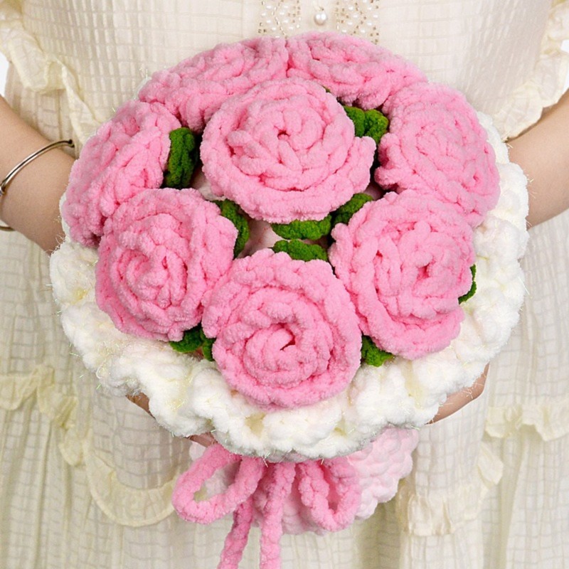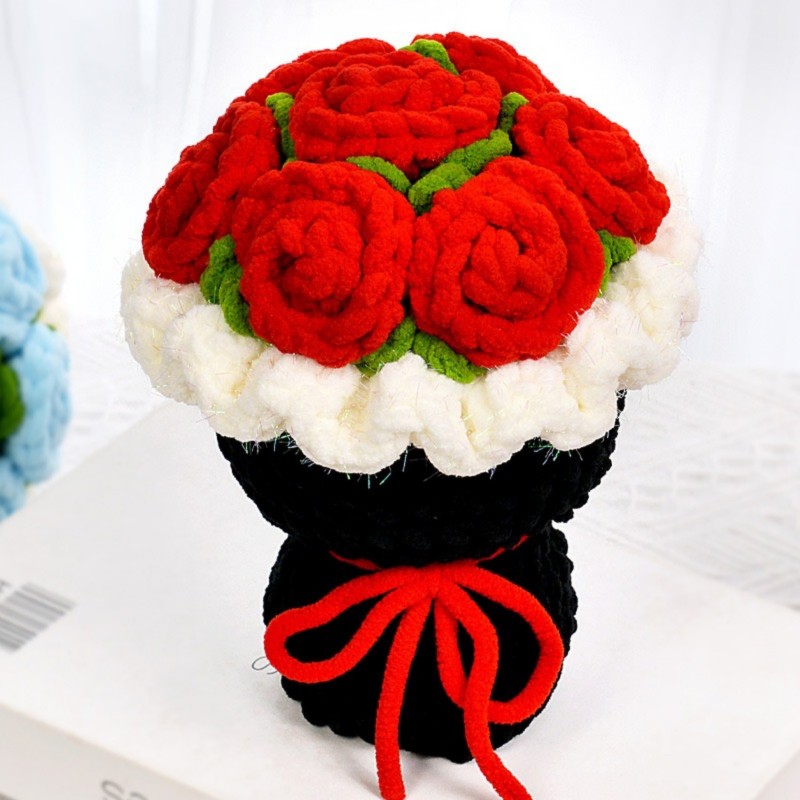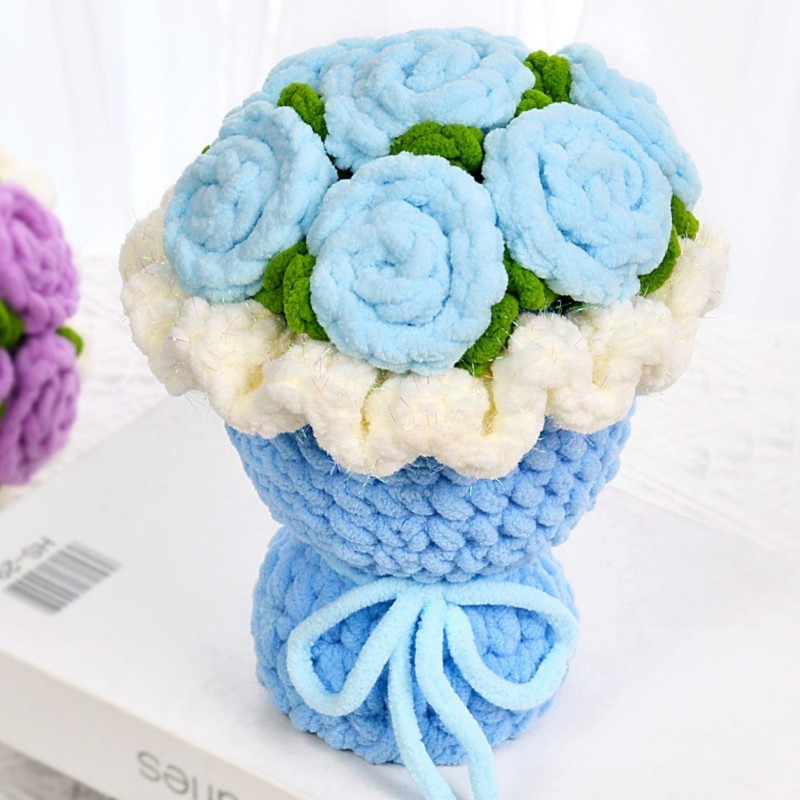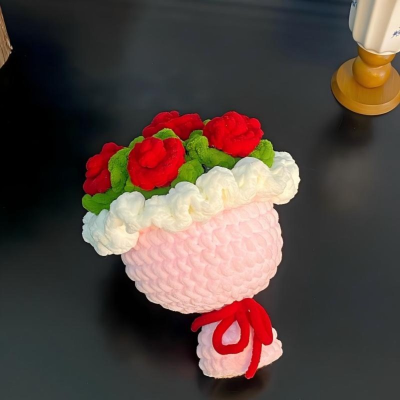 Hand-crocheted from soft ice chenille yarn, this rose bouquet captures the moment of bloom with its unique texture and gentle touch. Each petal is carefully shaped—fluffy yet resilient, as if freezing time in its most beautiful form.
