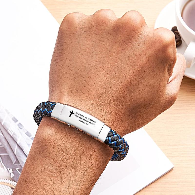 Crafted with precision and artistry, our Men's Inspirational Mantra Engraved Handmade Blue Braided Leather Cuff Bangle Bracelet is the epitome of sophistication. Made from high-quality leather, this adjustable bracelet boasts a stylish blue braided design. With its engraved mantra, this bracelet serves as a meaningful and elegant gift, reflecting a man's impeccable taste.