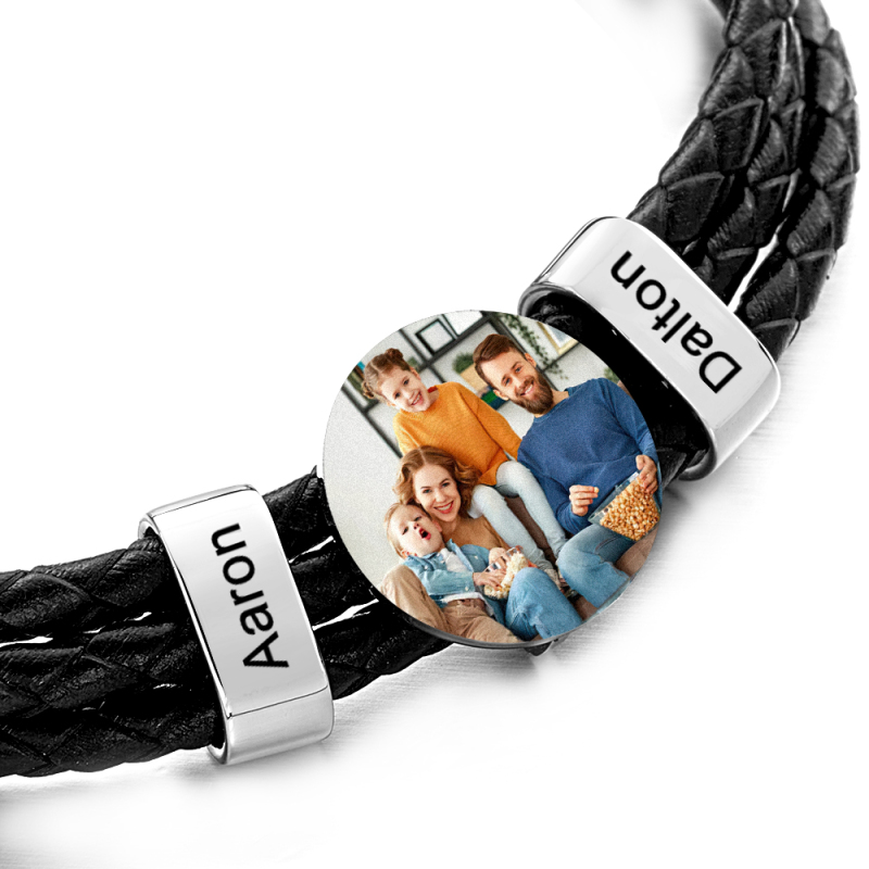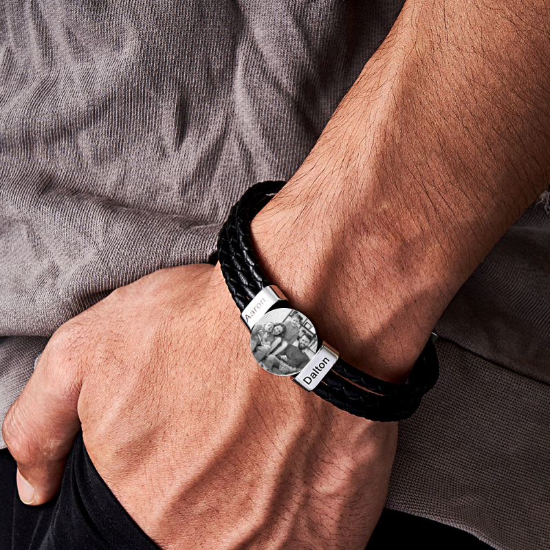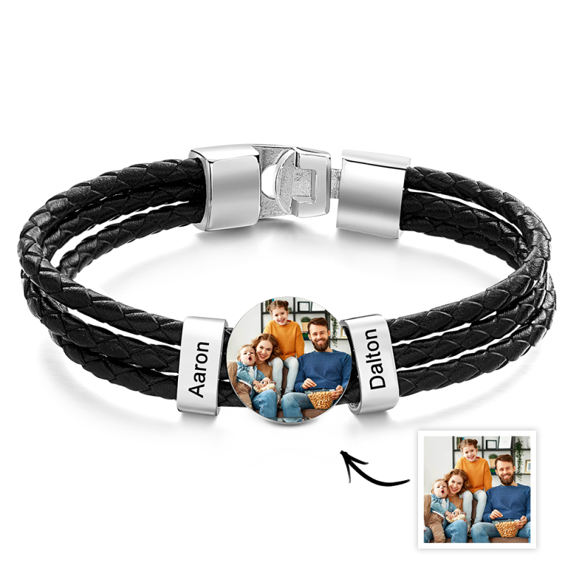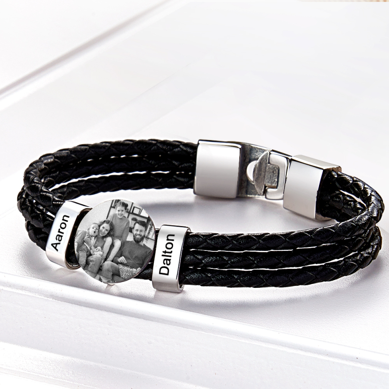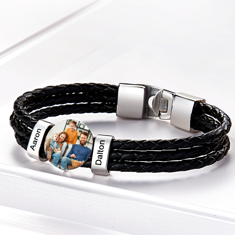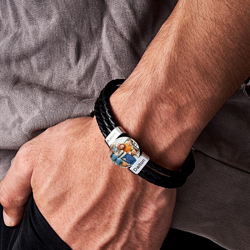 This personalised Father's Day gift is truly one-of-a-kind. Crafted with stainless steel and genuine leather, the men's leather photo bracelet features a custom family name for a unique and meaningful gift. A perfect blend of style and sentiment, this handmade item will make Dad's day.