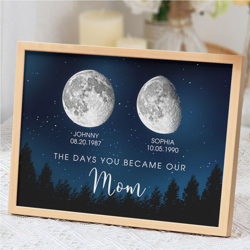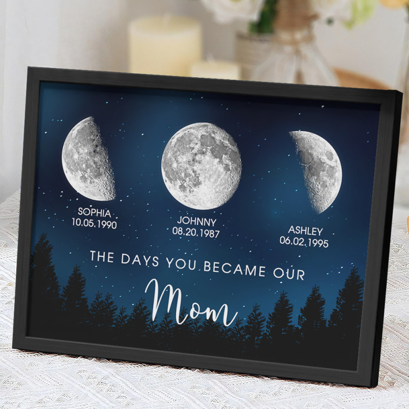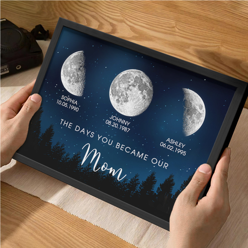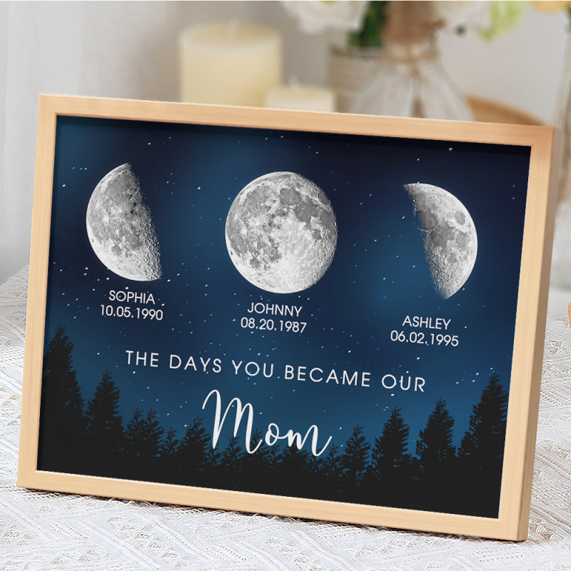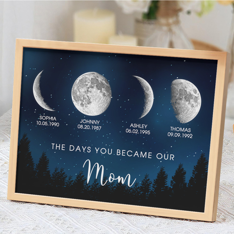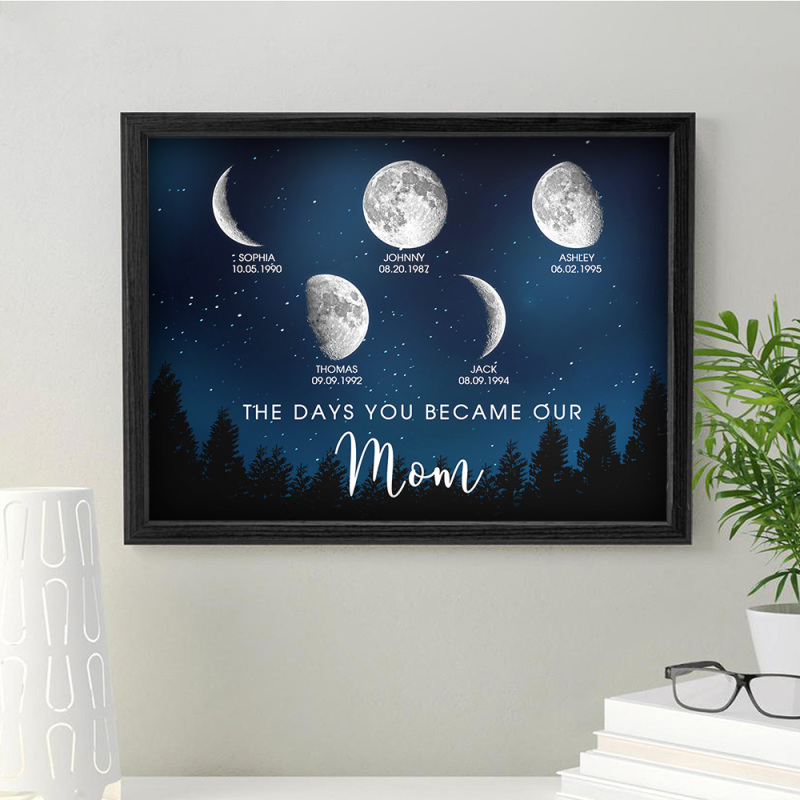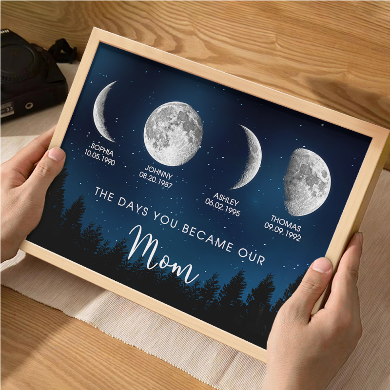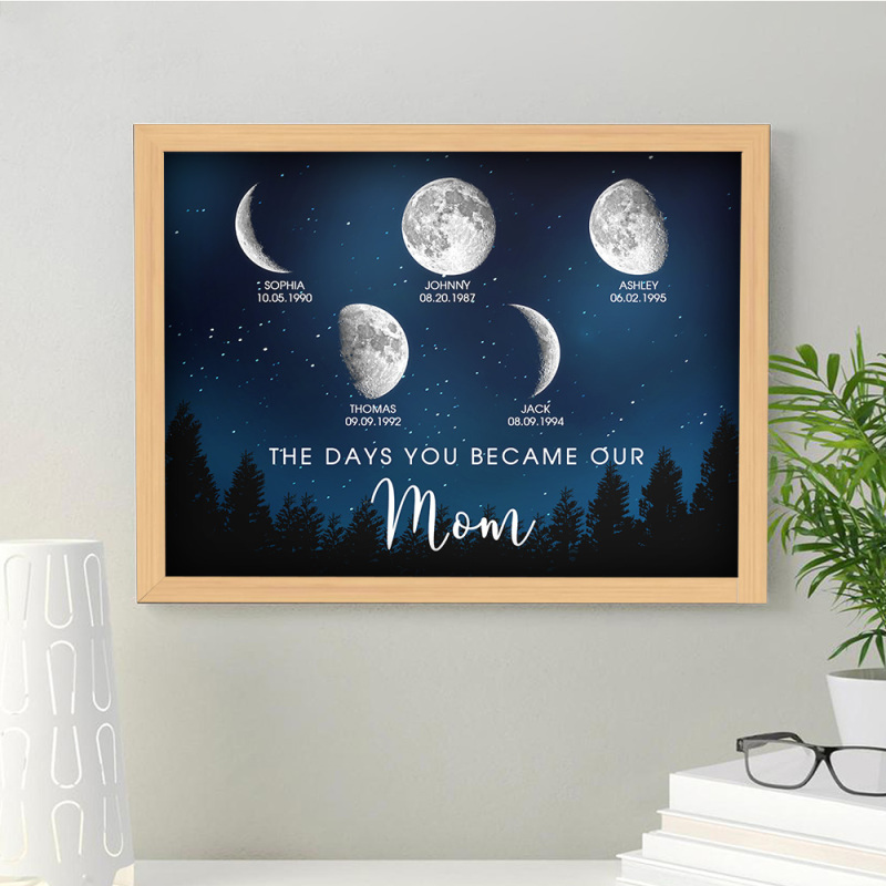 Each child’s name, birthdate, and unique moon phase are beautifully displayed, creating a one-of-a-kind celestial keepsake that honors the special moments that made her a mother.
