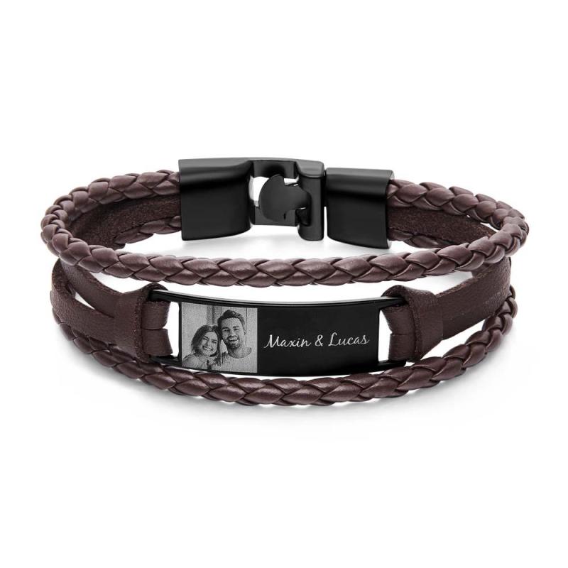 Customizable Masculine Classic Jewelry Gifts for Men.Fashionable Leather Clean Minimalist Man Bracelet with Engraving. The perfect gift for dad father son boyfriend husband. Surprise your loved ones with a great gift for his birthday Christmas Father's Day or any other occasions.Made of high-end black leather, stainless steel clasp and silver metal plate.Exquisitely printed pictures and carefully carved text give your loved one a long-lasting touch.