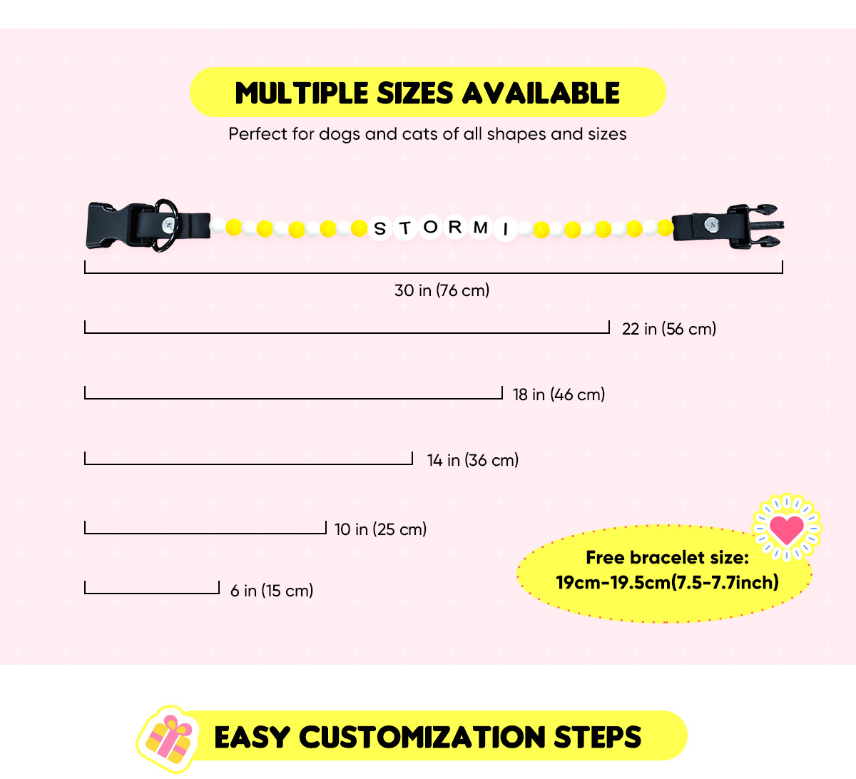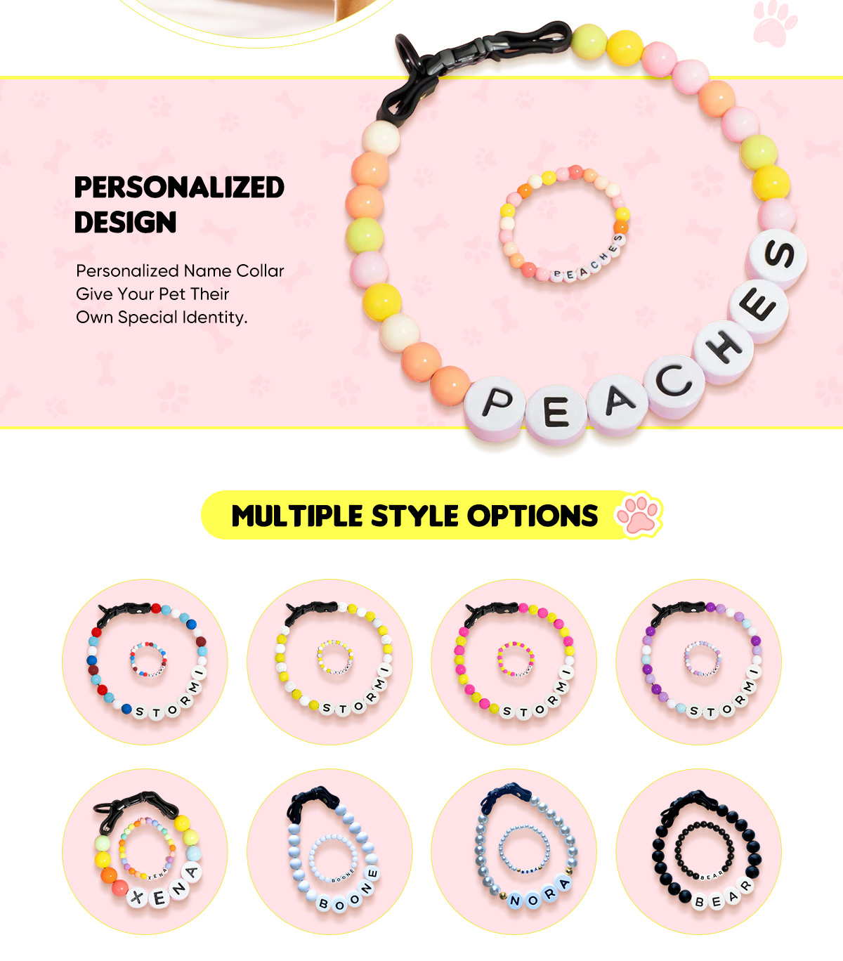 Each collar is lovingly personalized with your pet’s name using fun, colorful beads. And now, you get a bracelet to match - totally FREE! Wear it to show off your love and style together.