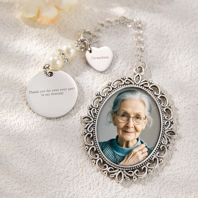 Enhance any bouquet with our Personalized Photo Bouquet Charm, including a heart pendant and room for a photo. This charm serves as a touching memorial wedding gift for the bride, customizable with a meaningful photo. The heartfelt memories will be treasured for eternity.