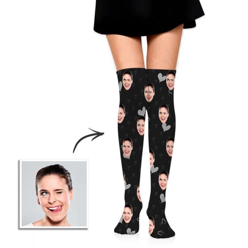 Custom Face Socks, Personalised Knee High Printed Picture Adult Tube Face Socks with Little Hearts