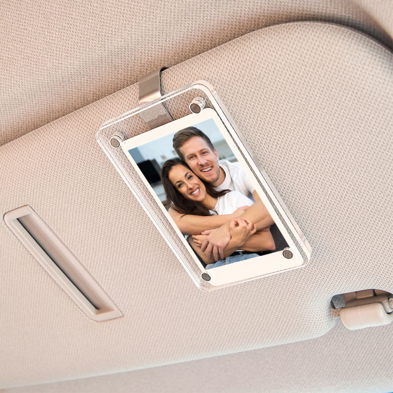 Frame measures 2.36 x 3.54 inches **You will receive an EMPTY frame with a visor clip adhered to the back - no photo is included** Slide the two magnetic pieces apart and add your own photo! Perfect size for displaying your favorite instant photos