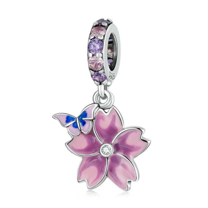 Pink Butterfly and Flower Dangle Charm Silver