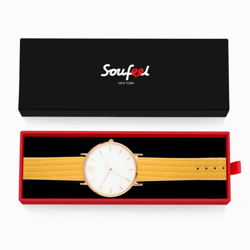 Soufeel adopts the watch movements manufactured by world's leading movement manufacturer Ronda in Switzerland and Citizen in Japan, you will enjoy the precise time as you wish. Daily life water resistant. It is a true designer statement and the perfect watch for any occasions. This watch has a simple and unique design, with a slim case, you can easily match any type of accessories to it. This classic timepiece is a perfect gift for you or your friends in a sleek and luxurious way. Soufeel has a ton of customized Jewellery options that are reasonably priced and make for great gifts for all sorts of occasions like birthdays, holidays, anniversaries. It's great for layering, a wonderful minimalist piece, perfect gift for your wife, girlfriend, husband, boyfriend or simply to treat yourself! Simply Style Dial Watch Yellow Leather Strap - Women's.